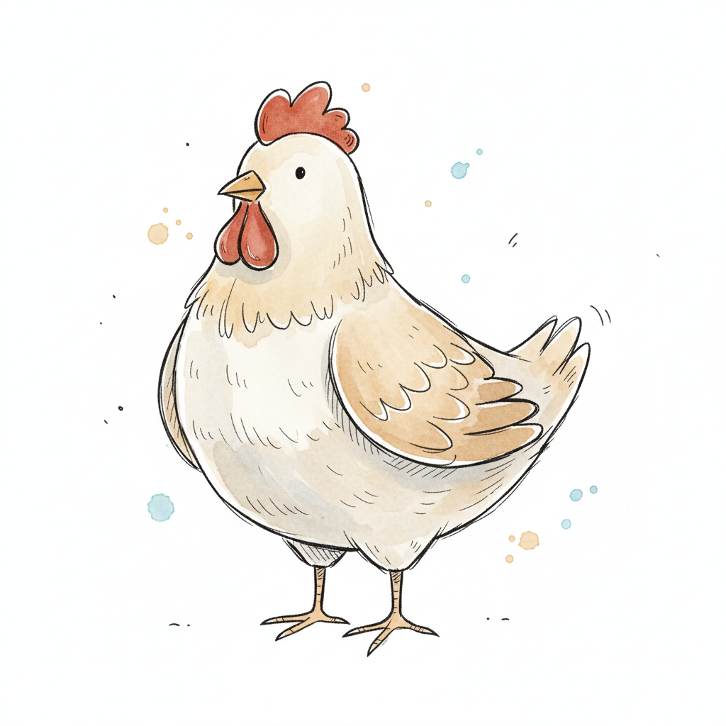 Niedliche, gezeichnete Henne in hellen Farben mit rotem Kamm und Kehllappen, im Aquarellstil.