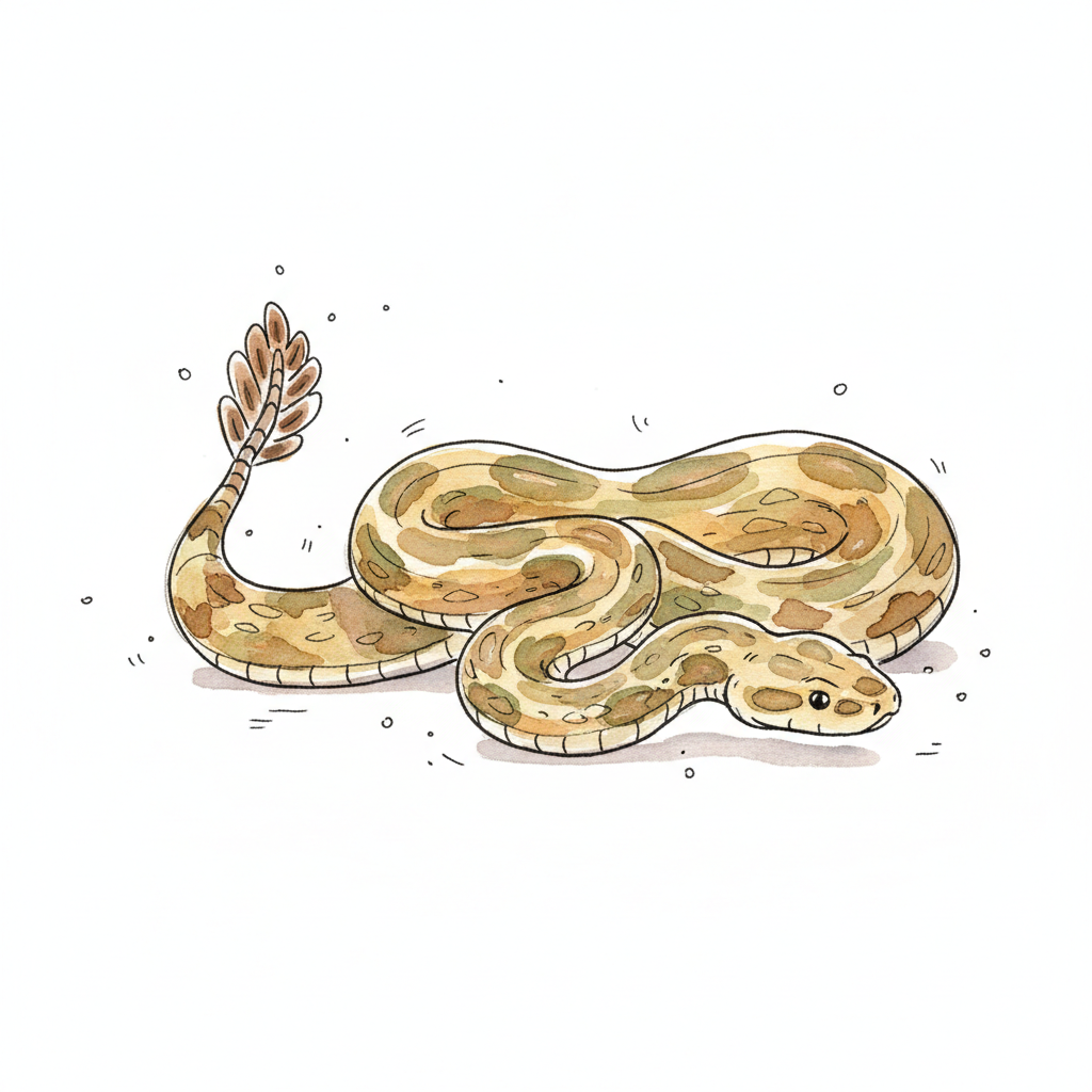 Eine illustrierte Klapperschlange in Erdtönen, die sich auf dem Boden windet.
