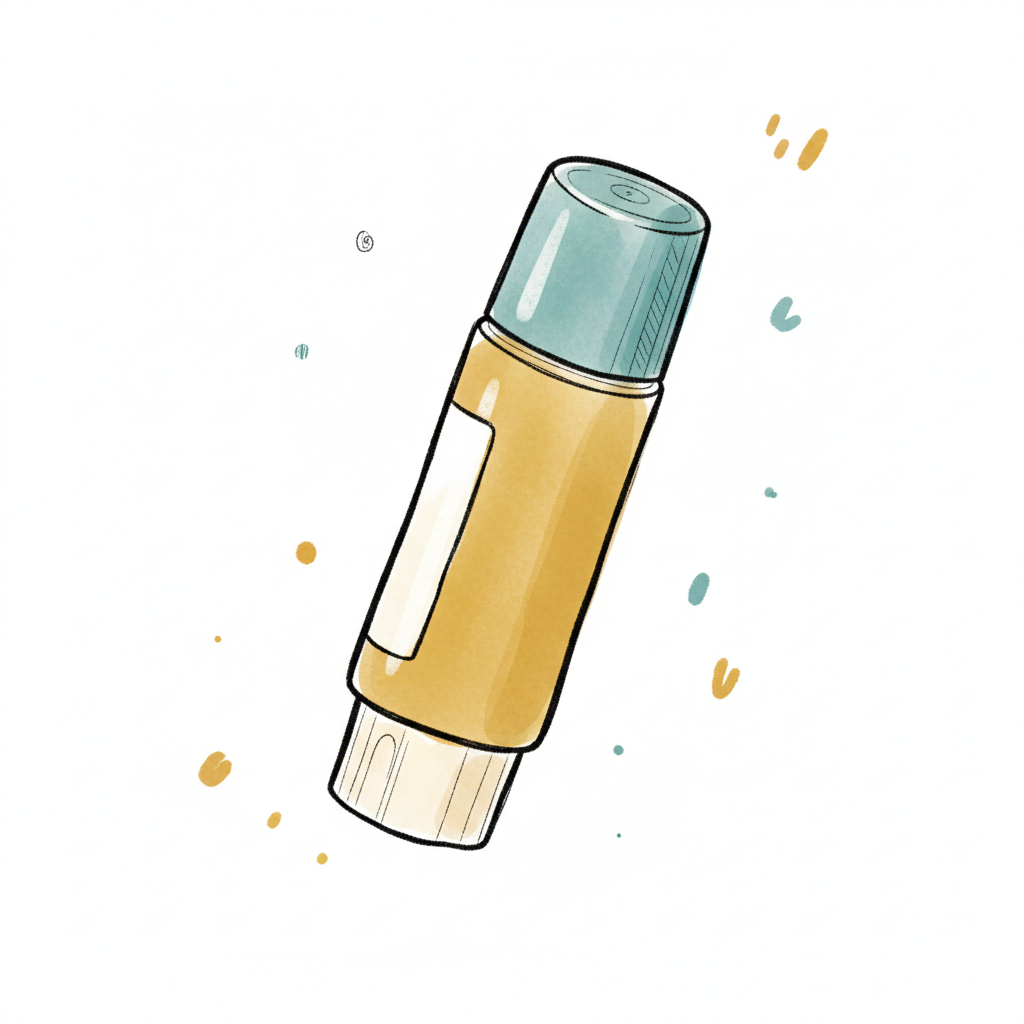 Stilisierte Zeichnung eines gelben Lippenbalsamstifts mit blaugrüner Kappe und Farbspritzern.