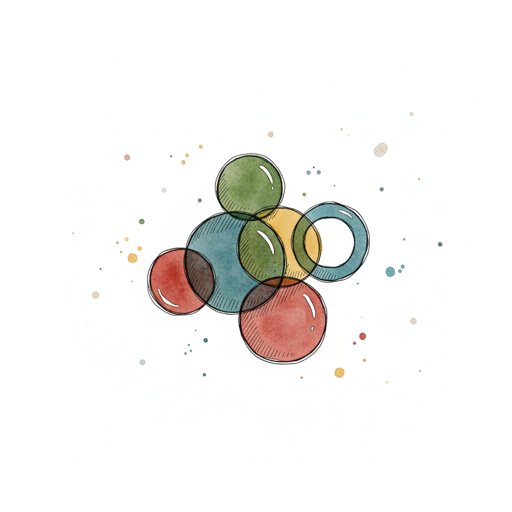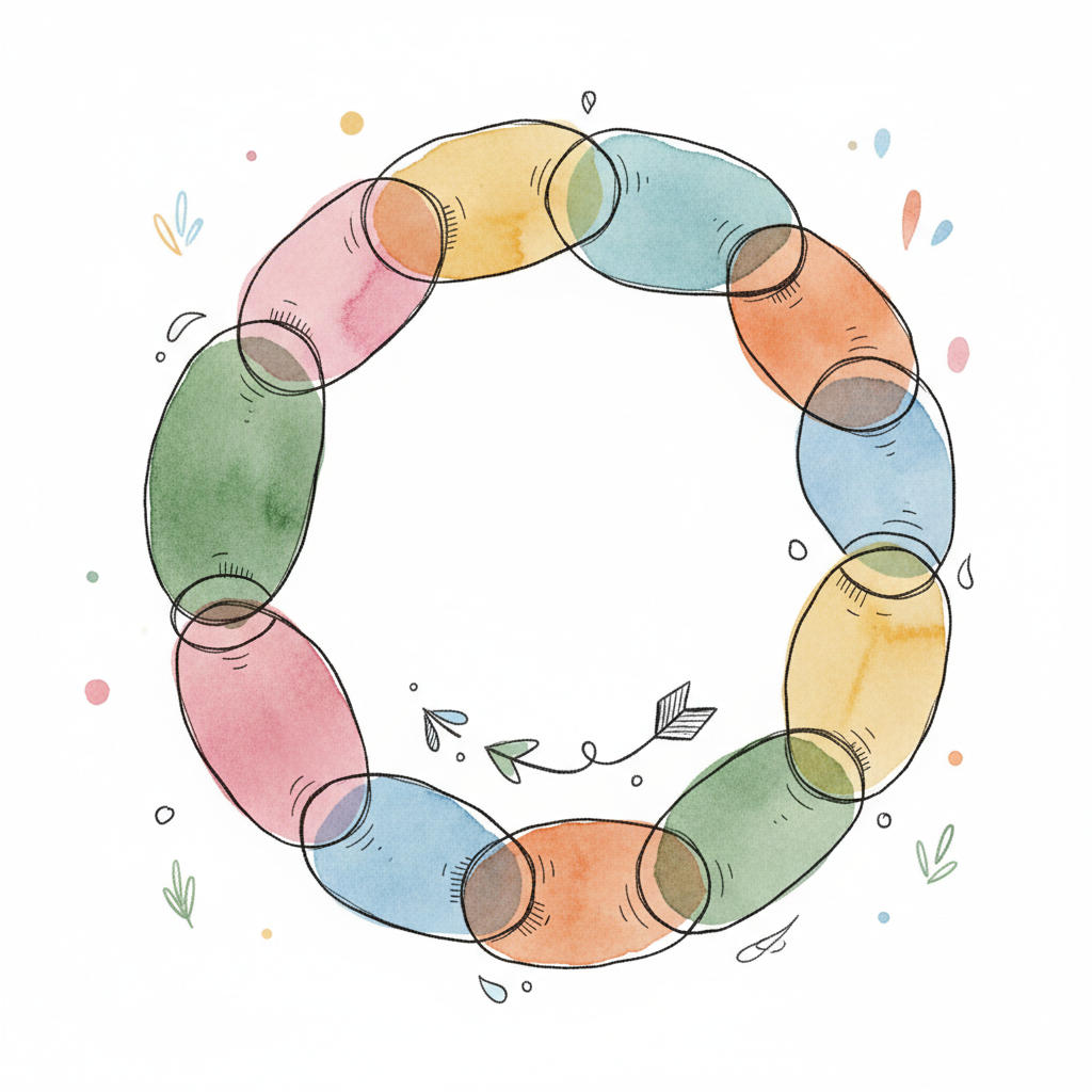 Aquarell-Illustration eines Kreises aus bunten, überlappenden Ovalen mit skizzenhaften Details.
