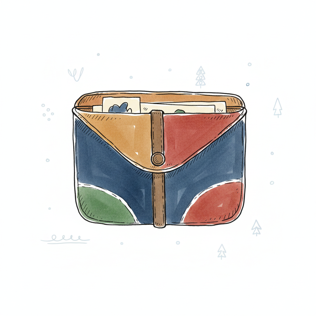 Bunte, handgezeichnete Tasche mit Papieren und abstrakten Elementen im Hintergrund.