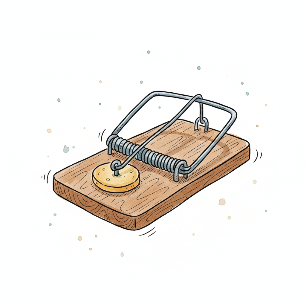 Illustrierte Mausefalle mit Käse als Köder auf einem Holzbrett, bereit zum Schnappen.