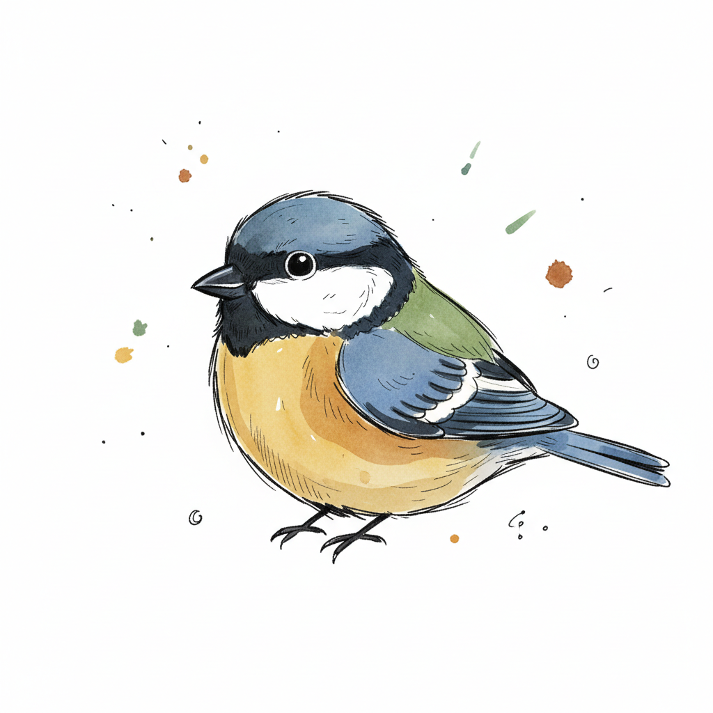 Aquarell-Illustration einer Blaumeise mit blauer Kappe und gelbem Bauch auf weißem Hintergrund.