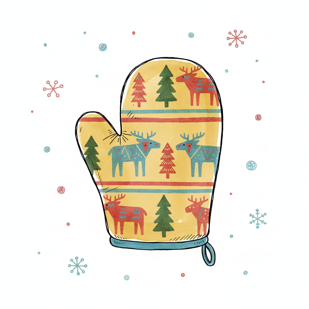 Winterlicher Topflappen mit Rentier- und Tannenbaum-Muster auf gelbem Grund, umgeben von Schneeflocken.