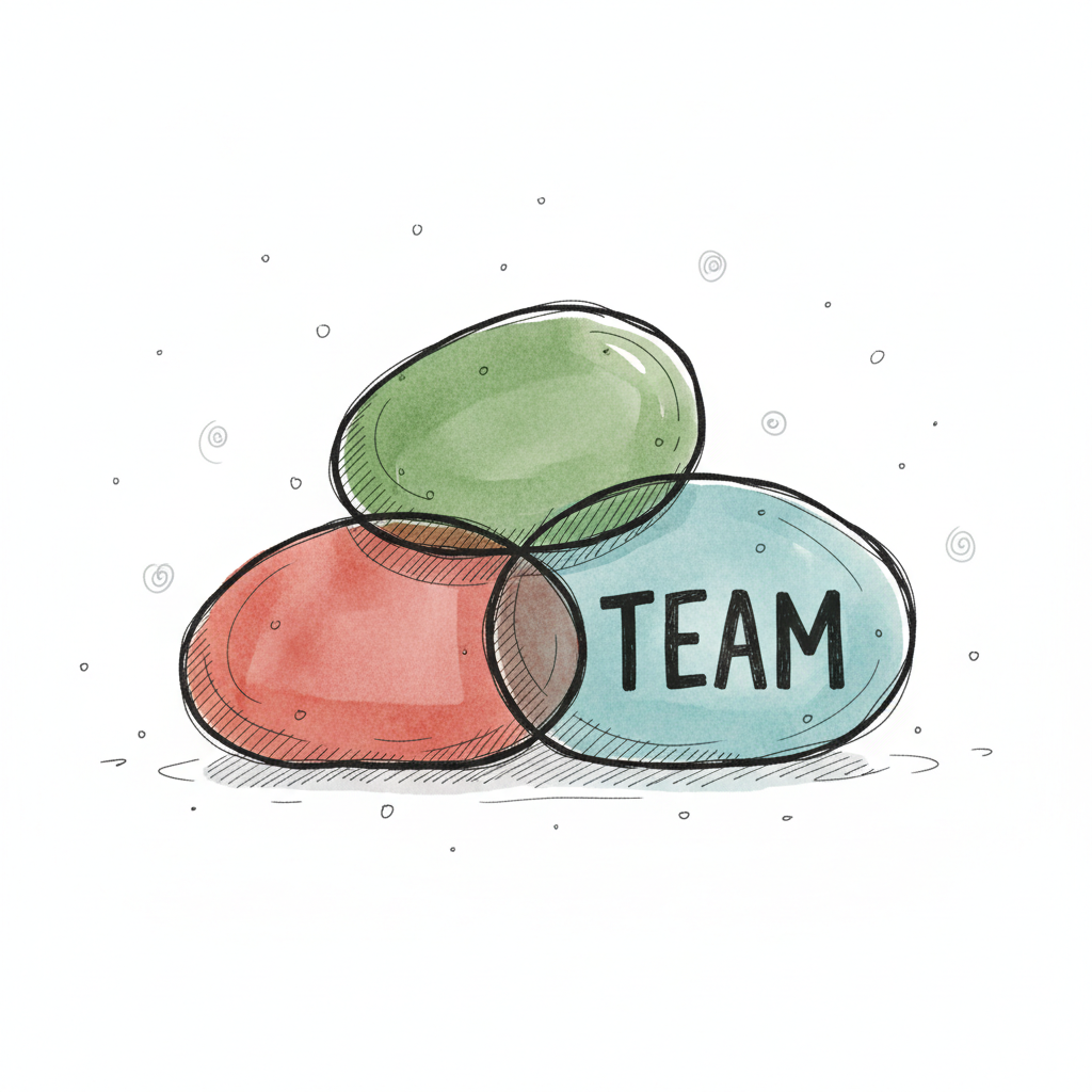 Drei überlappende, farbige Ovale im Aquarellstil, eines mit 'TEAM' beschriftet.