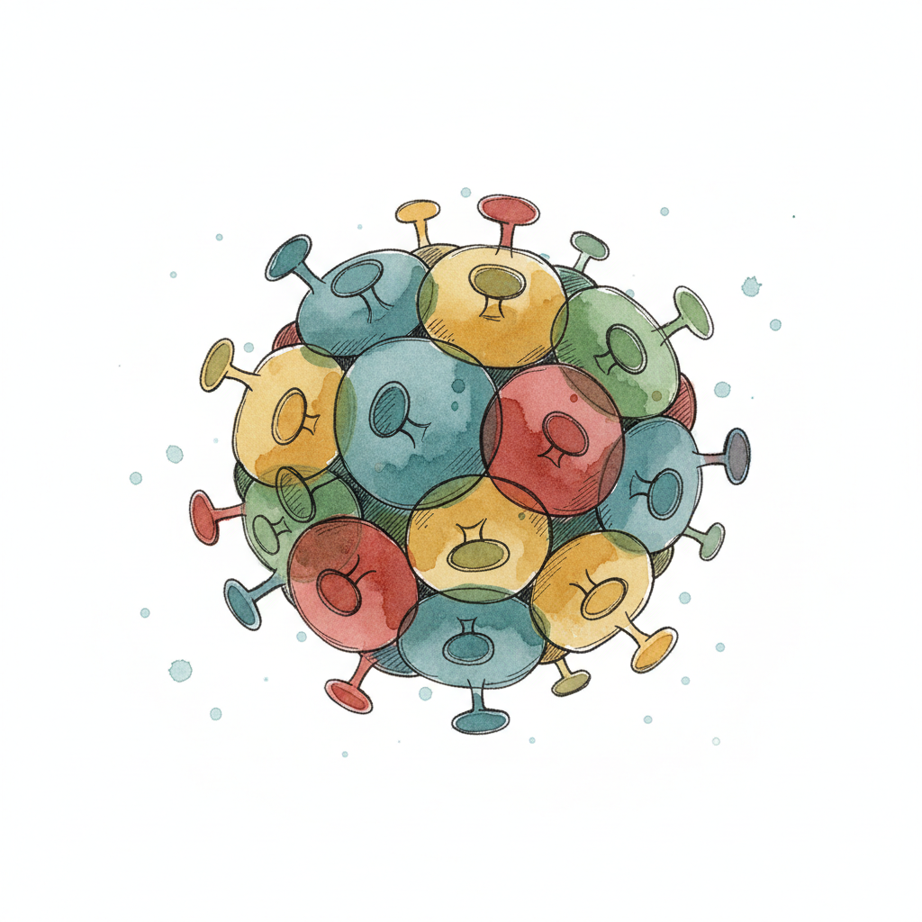 Buntes, stilisiertes Virus-Aquarell mit überlappenden Kreisen und Stacheln auf weißem Grund.