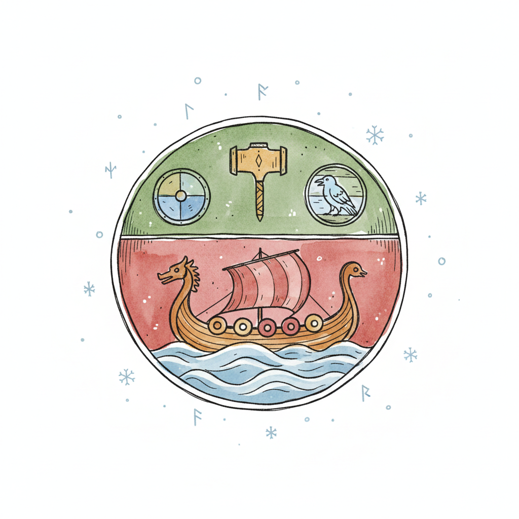 Wikinger-Illustration: Langschiff, Thors Hammer, Schild, Rabe in rundem Design.
