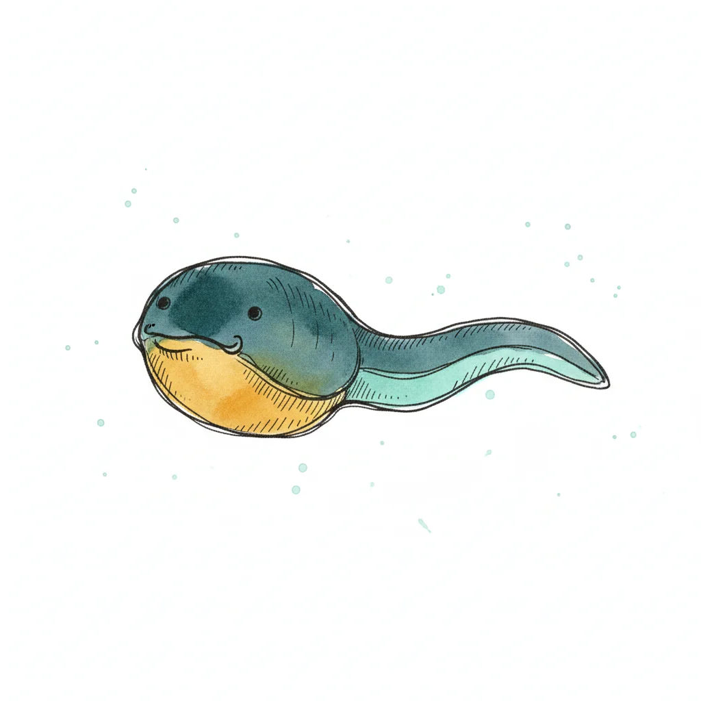 Illustration einer lächelnden Kaulquappe in Aquarellfarben (grün, gelb) auf weißem Grund.