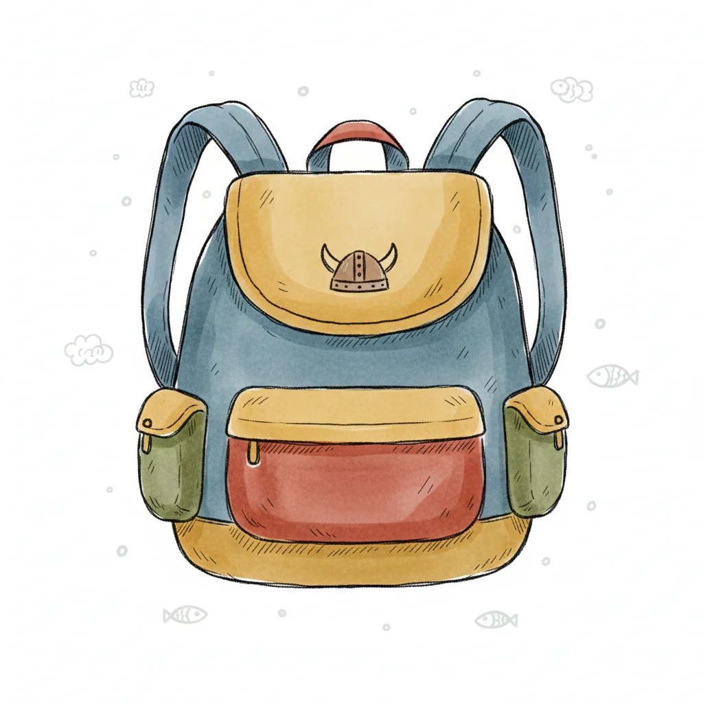 Aquarell-Illustration eines bunten Rucksacks mit Wikingerhelm-Symbol auf der Klappe.