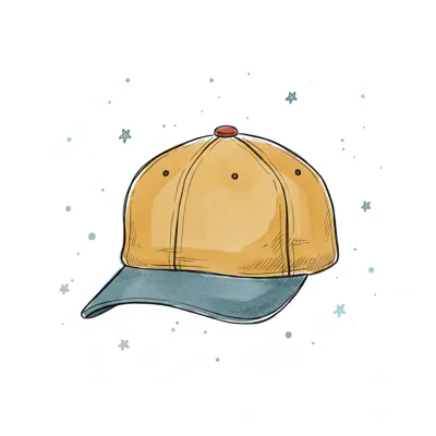 Aquarell-Illustration einer gelben Baseballkappe mit blauem Schirm und Sternen im Hintergrund.