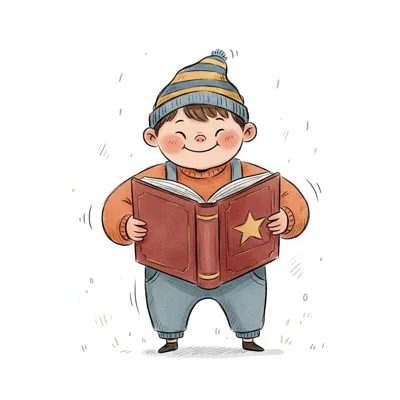 Fröhlicher Junge mit Mütze liest ein rotes Buch mit Stern. Aquarell-Illustration.