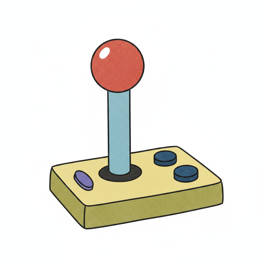 Illustration eines Retro-Arcade-Joysticks mit rotem Knauf und bunten Knöpfen auf gelber Basis.