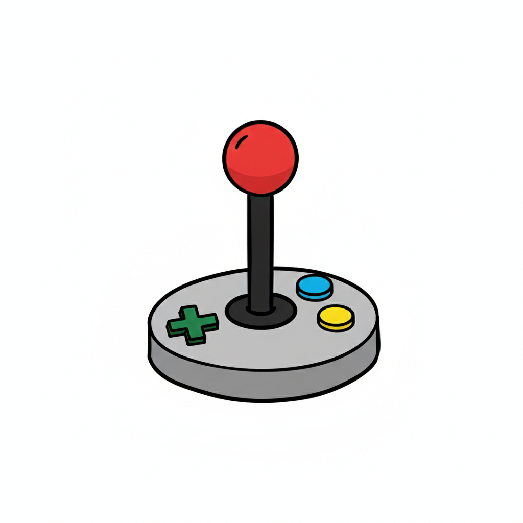 Illustration eines klassischen Arcade-Joysticks mit rotem Knauf, D-Pad und farbigen Knöpfen.