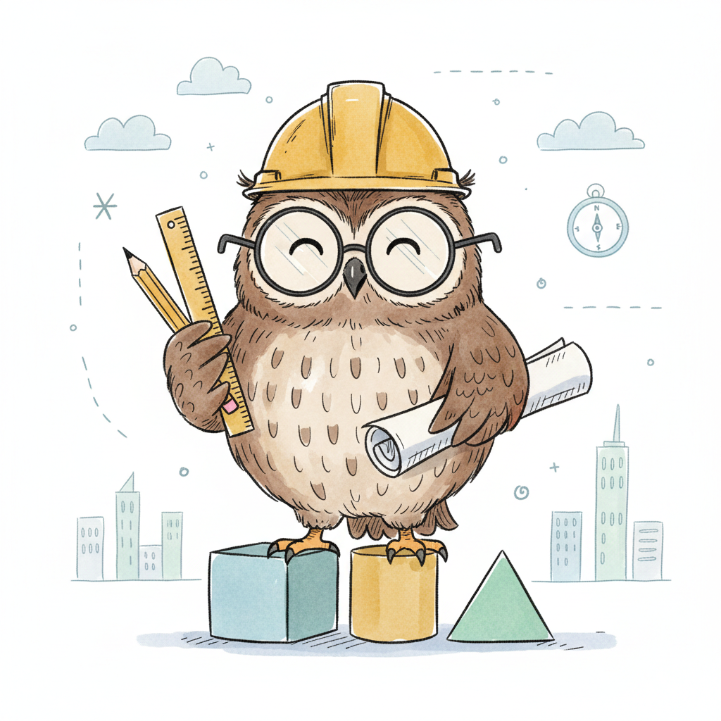 Cartoon-Eule als Architekt mit Helm, Brille, Werkzeugen und Bauplänen auf geometrischen Formen.