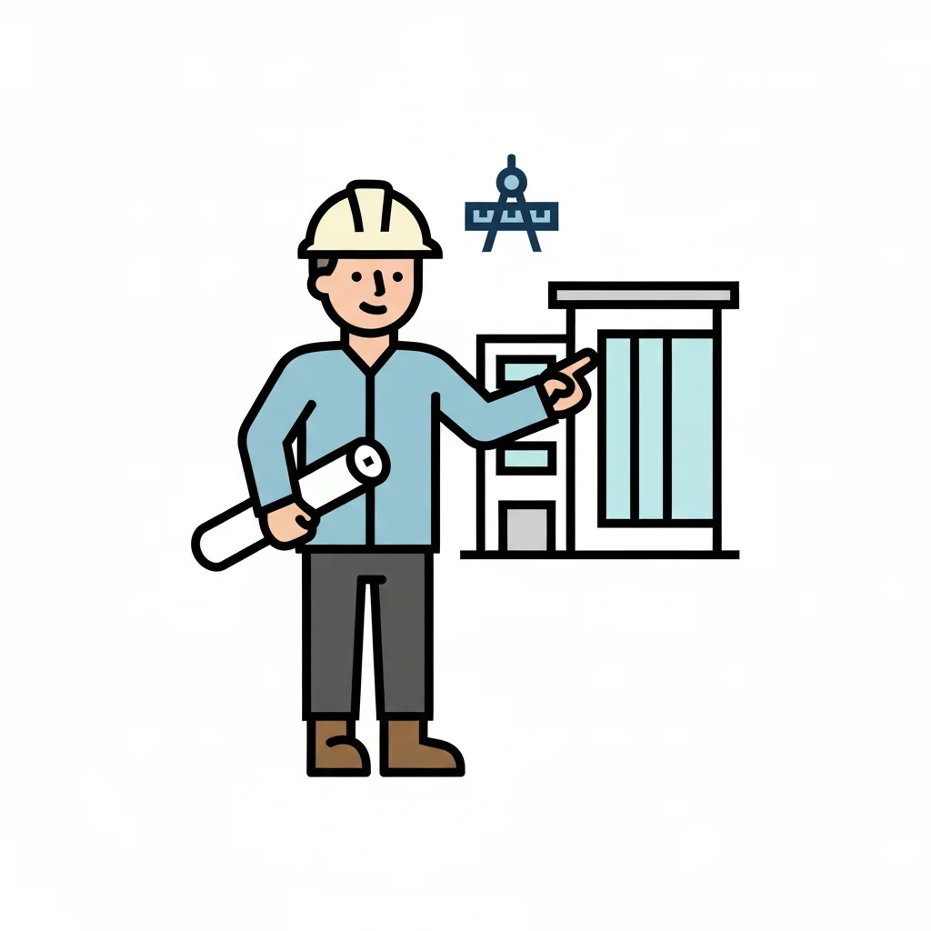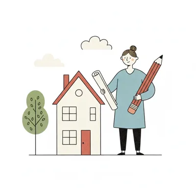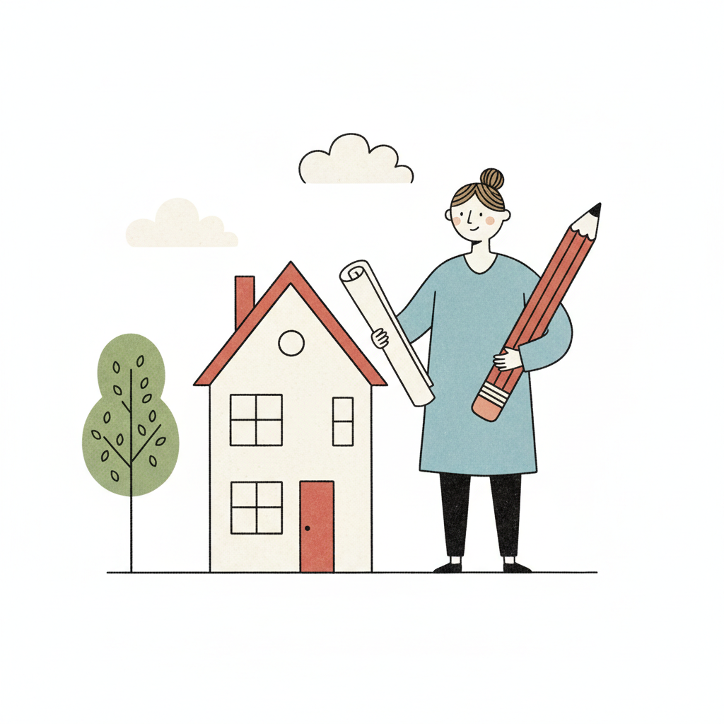 Illustration einer Person mit Bauplan und Bleistift vor einem Haus, symbolisiert Architektur/Planung.