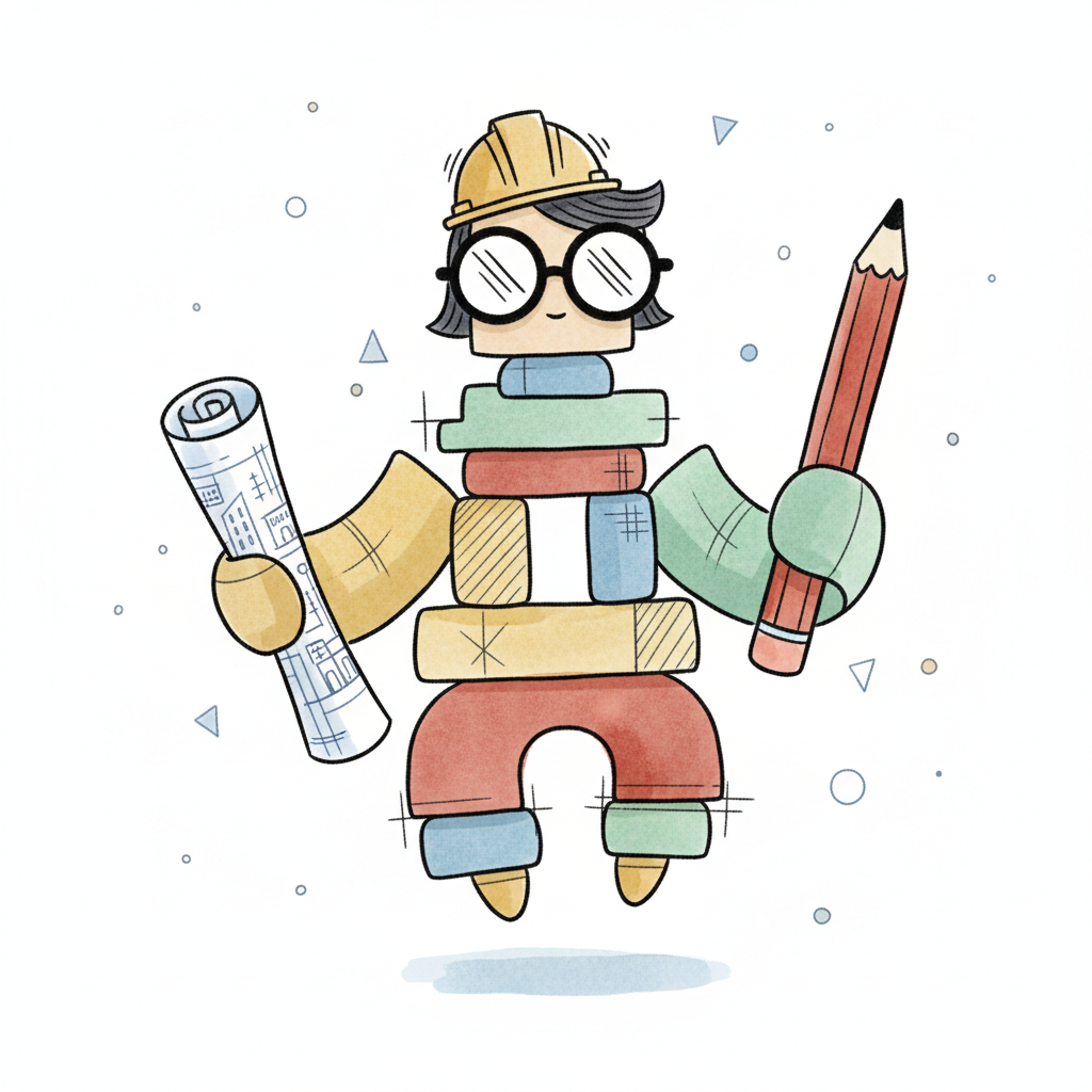 Figur aus bunten Bausteinen mit Bauhelm, Brille, Bauplan und Bleistift, schwebend.
