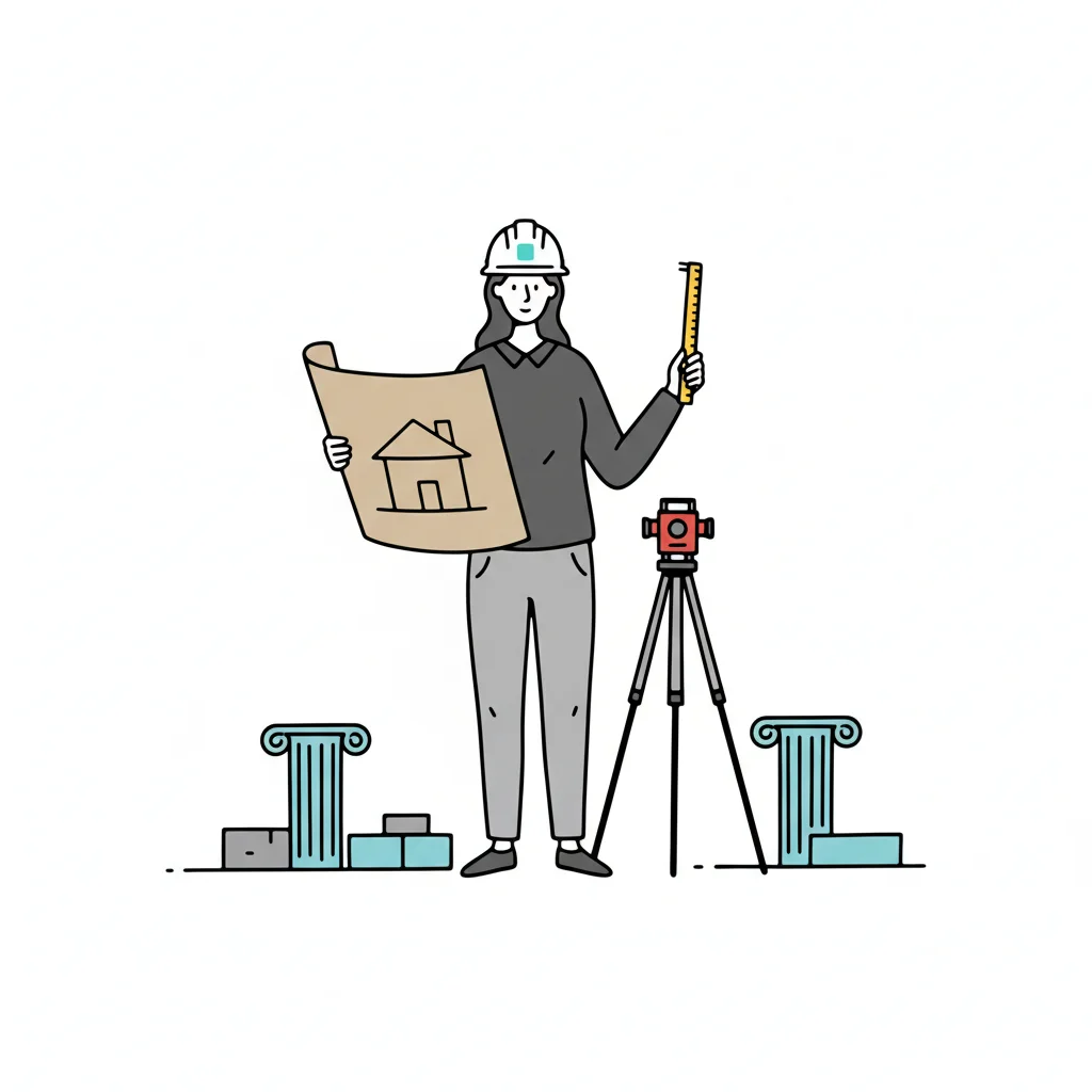 Architektin mit Bauplan, Zollstock und Vermessungsgerät, umgeben von Bauelementen.