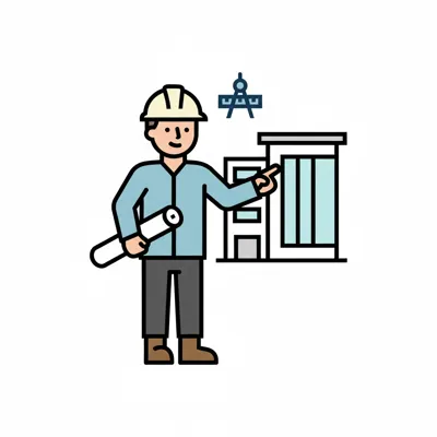 Ein Architekt mit Helm und Bauplan zeigt auf ein Gebäude, daneben ein Zirkel.