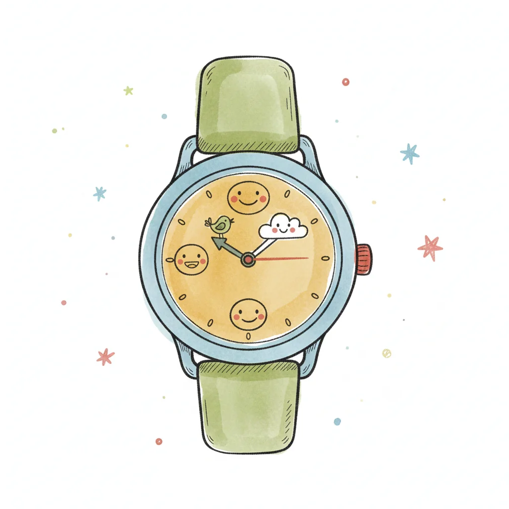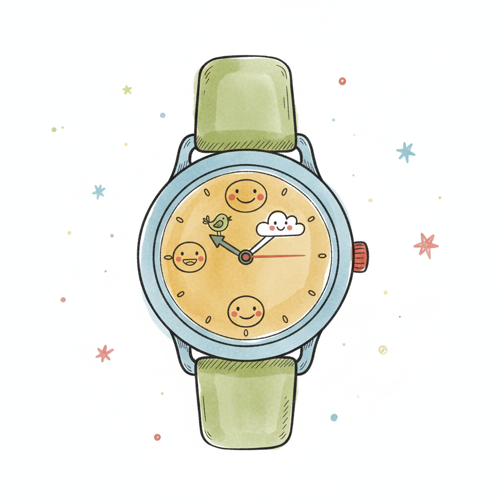 Niedliche Cartoon-Armbanduhr im Aquarellstil mit lächelnden Gesichtern, Vogel und Wolke auf dem Zifferblatt.
