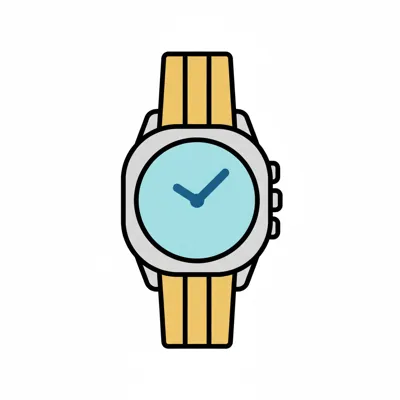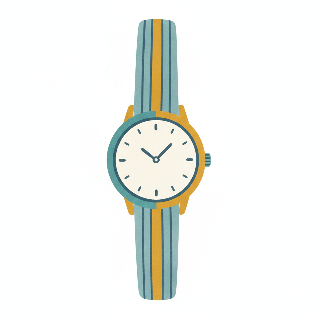 Schlichte Illustration einer Armbanduhr mit blau-gelb gestreiftem Armband und goldenem Gehäuse.