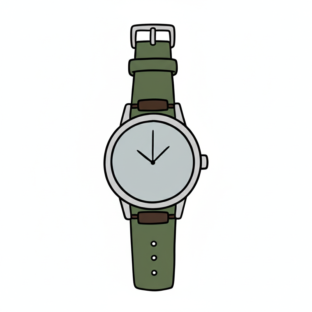Einfache Illustration einer Armbanduhr mit grünem Armband und hellem Zifferblatt.