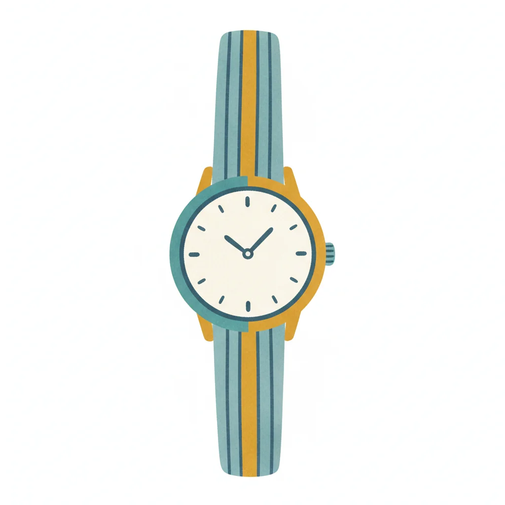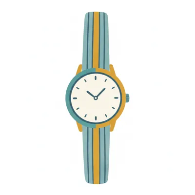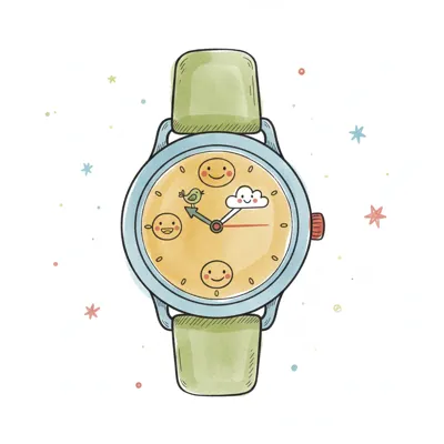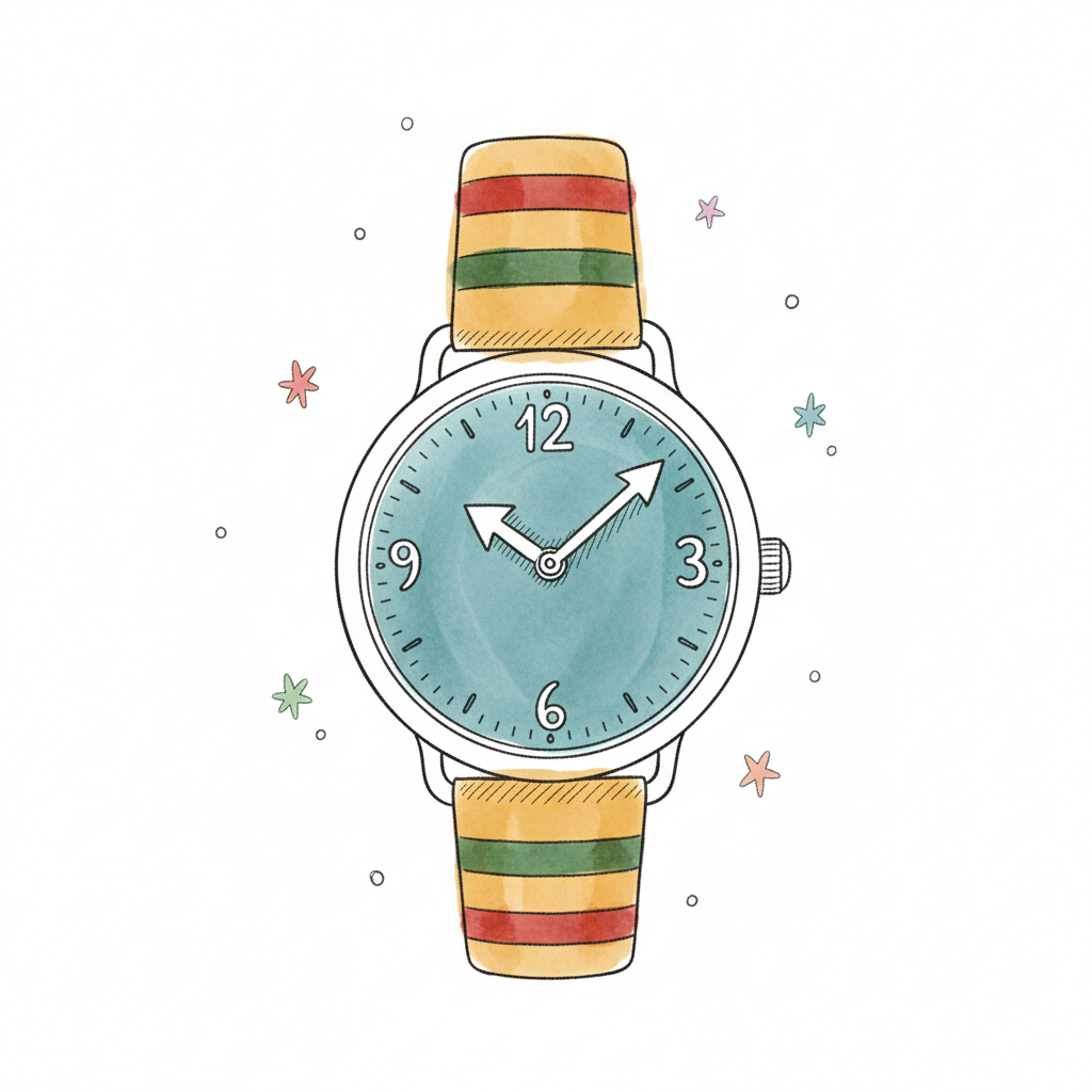 Handgezeichnete Armbanduhr mit blauem Zifferblatt und farbig gestreiftem Band, umgeben von Sternen.