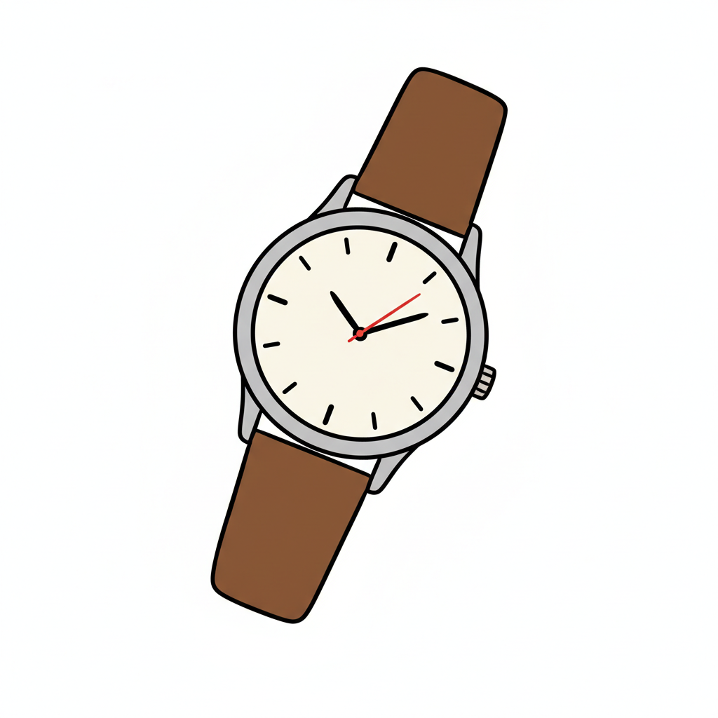 Illustration einer Armbanduhr mit braunem Lederarmband und hellem Zifferblatt.