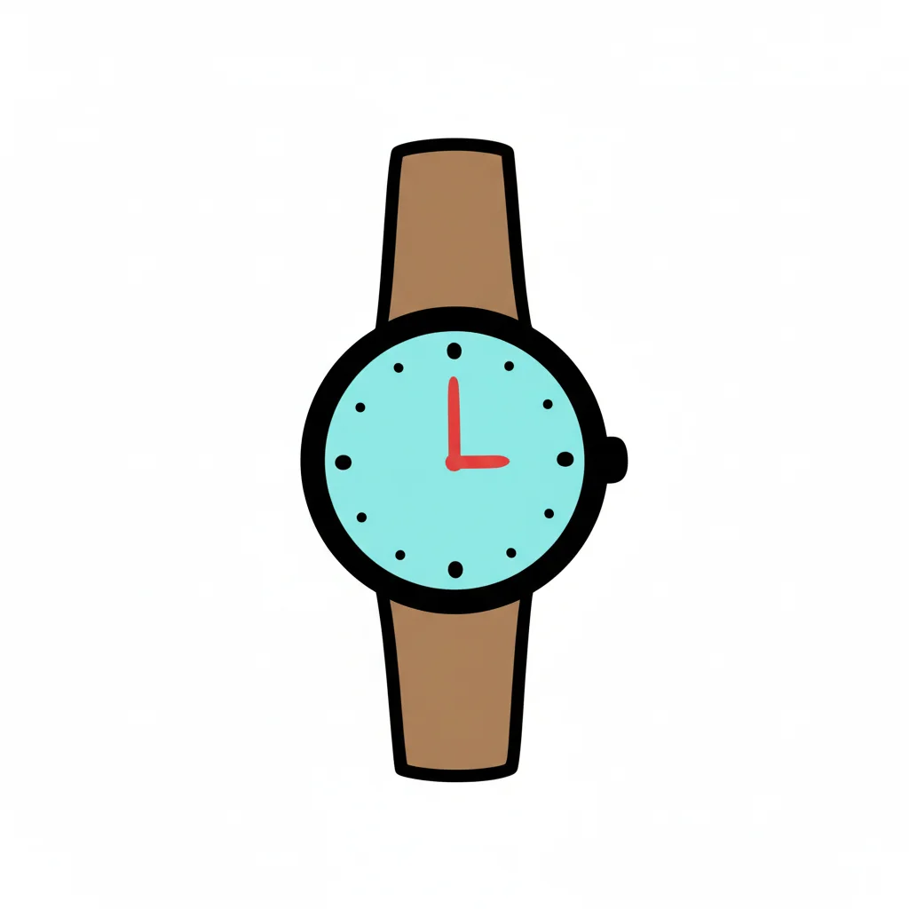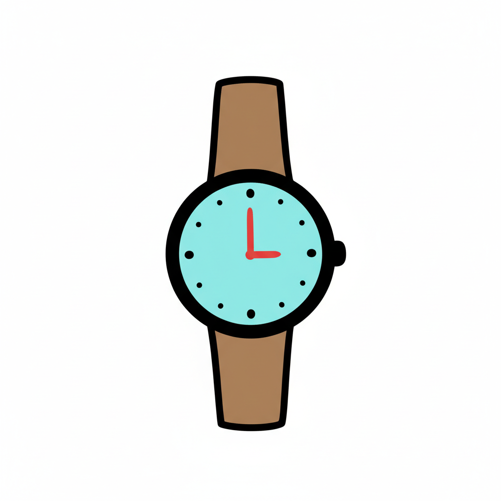Cartoon-Armbanduhr mit hellblauem Zifferblatt, roten Zeigern und braunem Band auf weißem Grund.