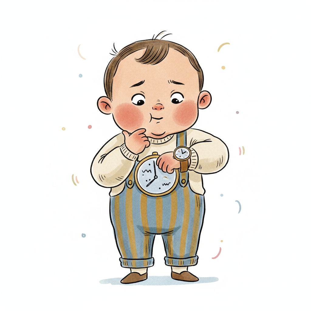 Niedliches Cartoon-Baby mit Uhr auf Latzhose und Armbanduhr, nachdenklich schauend.