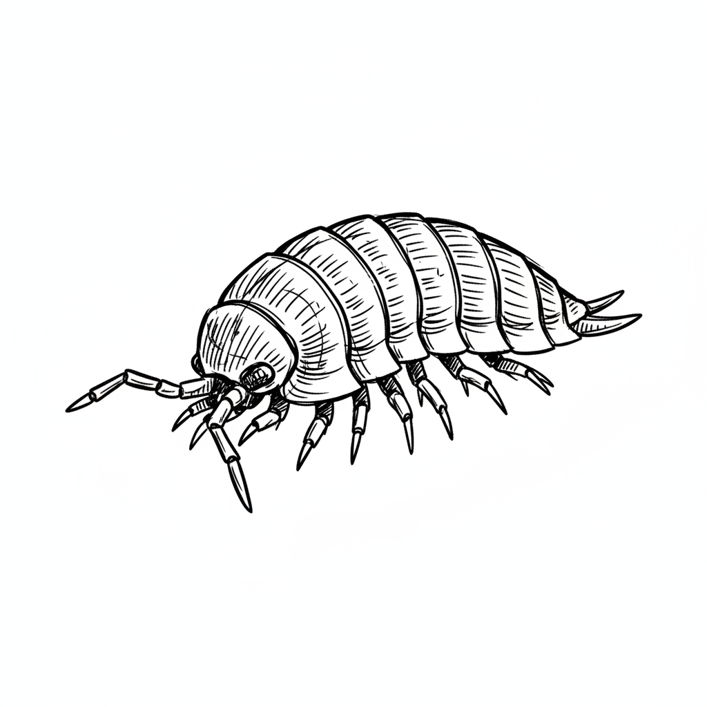 Ein detailliertes, skizziertes Bild eines Schrimps ähnlichen Lebewesens.