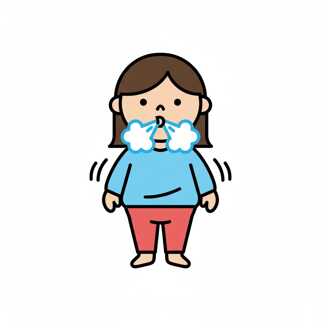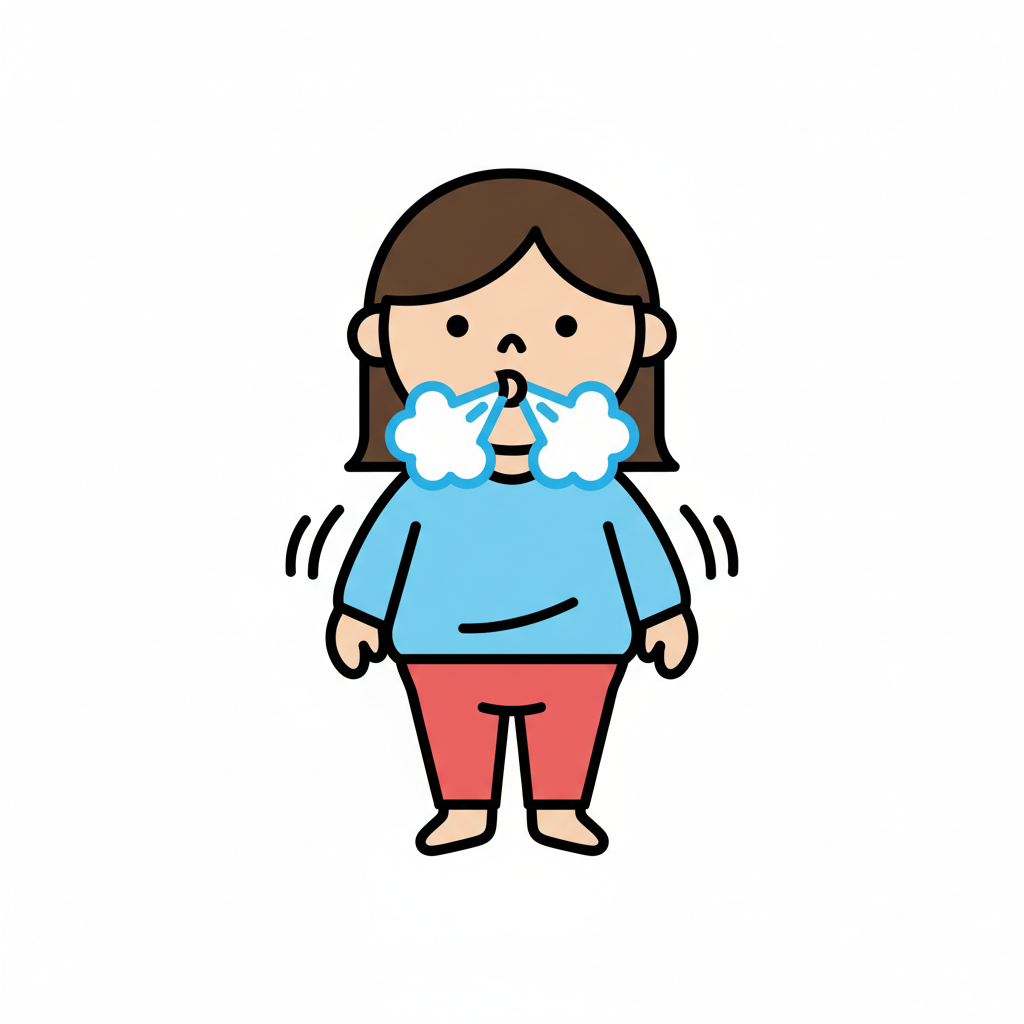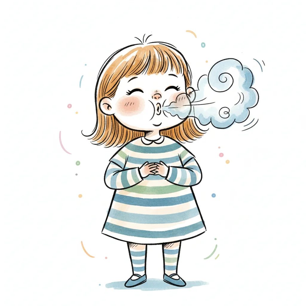 Niedliches Cartoon-Mädchen atmet aus, mit geschlossenen Augen und einem Lächeln.