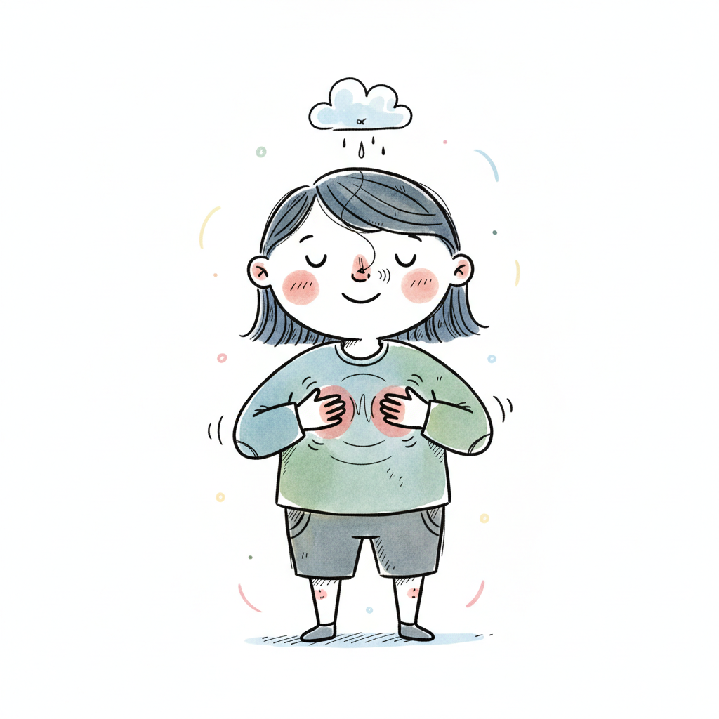 Cartoonfigur atmet ruhig, Hände auf der Brust, mit Regenwolke über dem Kopf, wirkt entspannt.