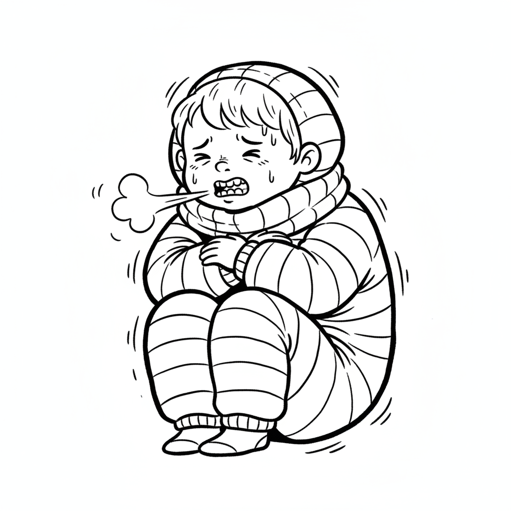Frierendes Kind in Winterkleidung, zitternd und Dampf ausatmend. Schwarz-weiß-Illustration.