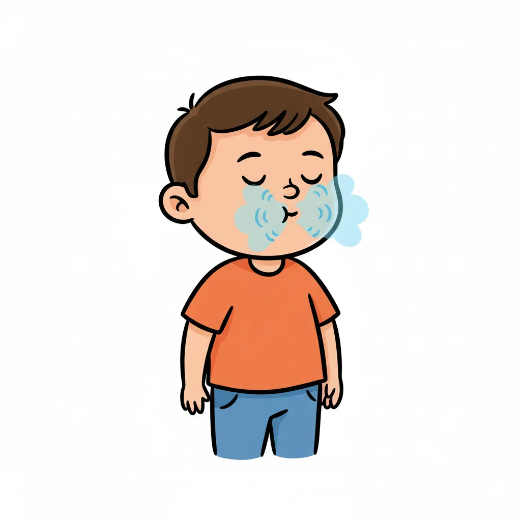 Ein Cartoon-Junge atmet ruhig aus, die Augen sind geschlossen.