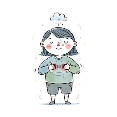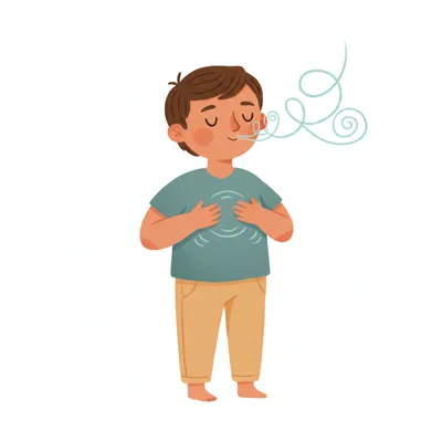 Illustrierter Junge atmet ruhig, Hände auf der Brust, Augen zu. Zeigt Entspannung und Achtsamkeit.
