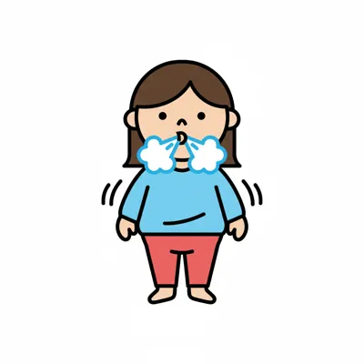 Junge bläst Luft aus, hält sich den Bauch, möglicherweise wegen Bauchschmerzen oder Aufstoßen.