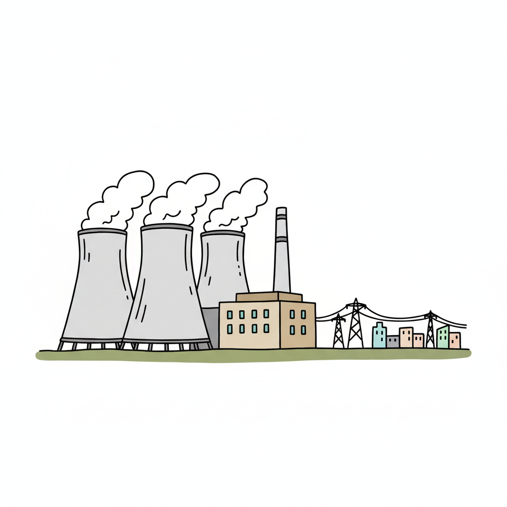 Illustration eines Kraftwerks mit drei Kühltürmen, Fabrikgebäuden, Stromleitungen und Stadtsilhouette.