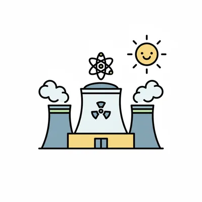 Stilisierte Darstellung eines Kernkraftwerks mit Kühltürmen, Atomzeichen und lächelnder Sonne.