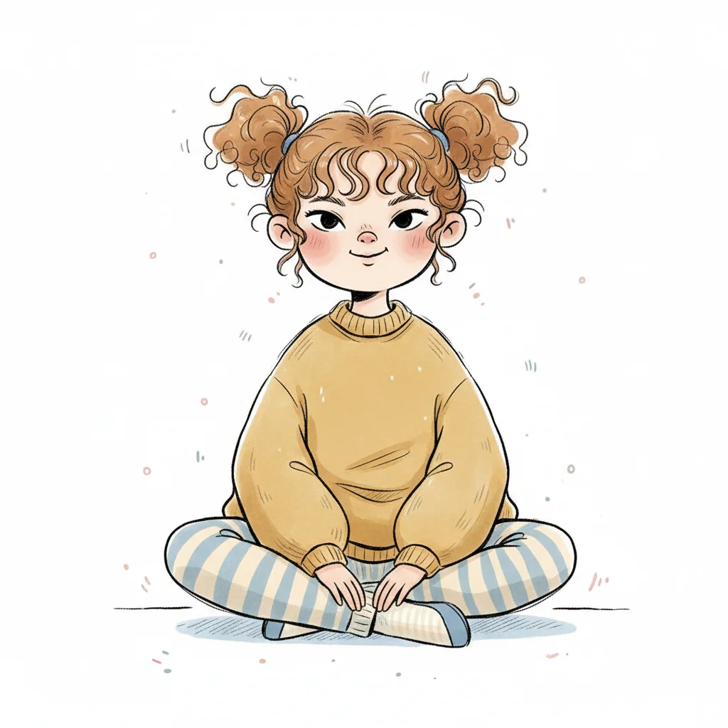 Ein Mädchen mit lockigem Haar in einem bequemen Pullover und gestreiften Hosen sitzt.