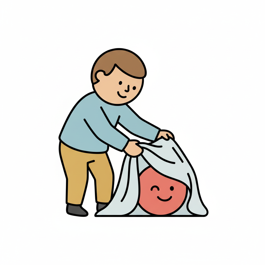 Ein lächelnder Cartoon-Mensch spielt Guck-Guck mit einem zwinkernden roten Gesicht unter einem Tuch.