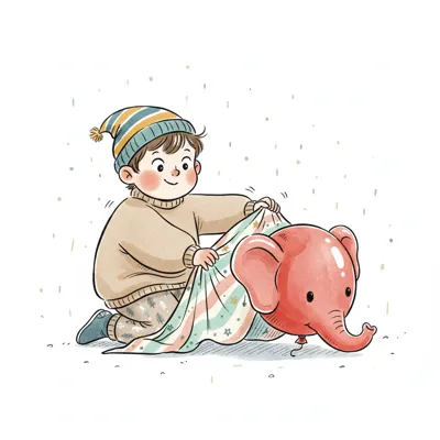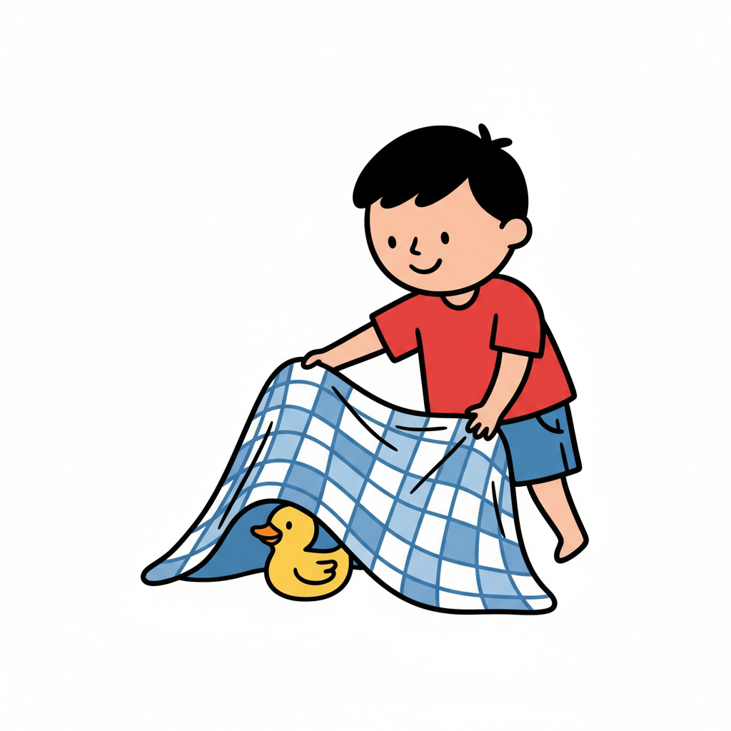Ein lächelnder Junge deckt eine gelbe Quietscheente mit einer blau-weiß karierten Decke zu.