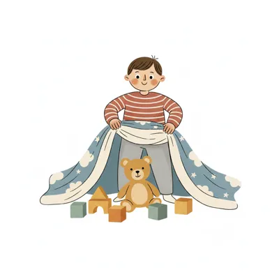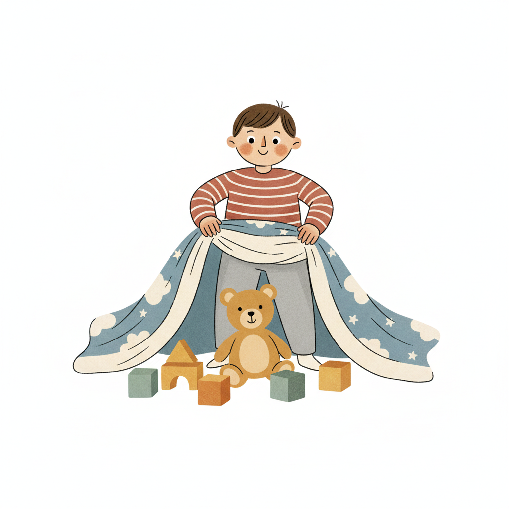Lächelndes Kind baut ein Decken-Zelt mit Teddybär und Bauklötzen. Kreatives Spiel.