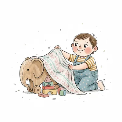Ein lächelndes Kind spielt mit einer Decke, einem Holz-Elefanten und Bauklötzen.