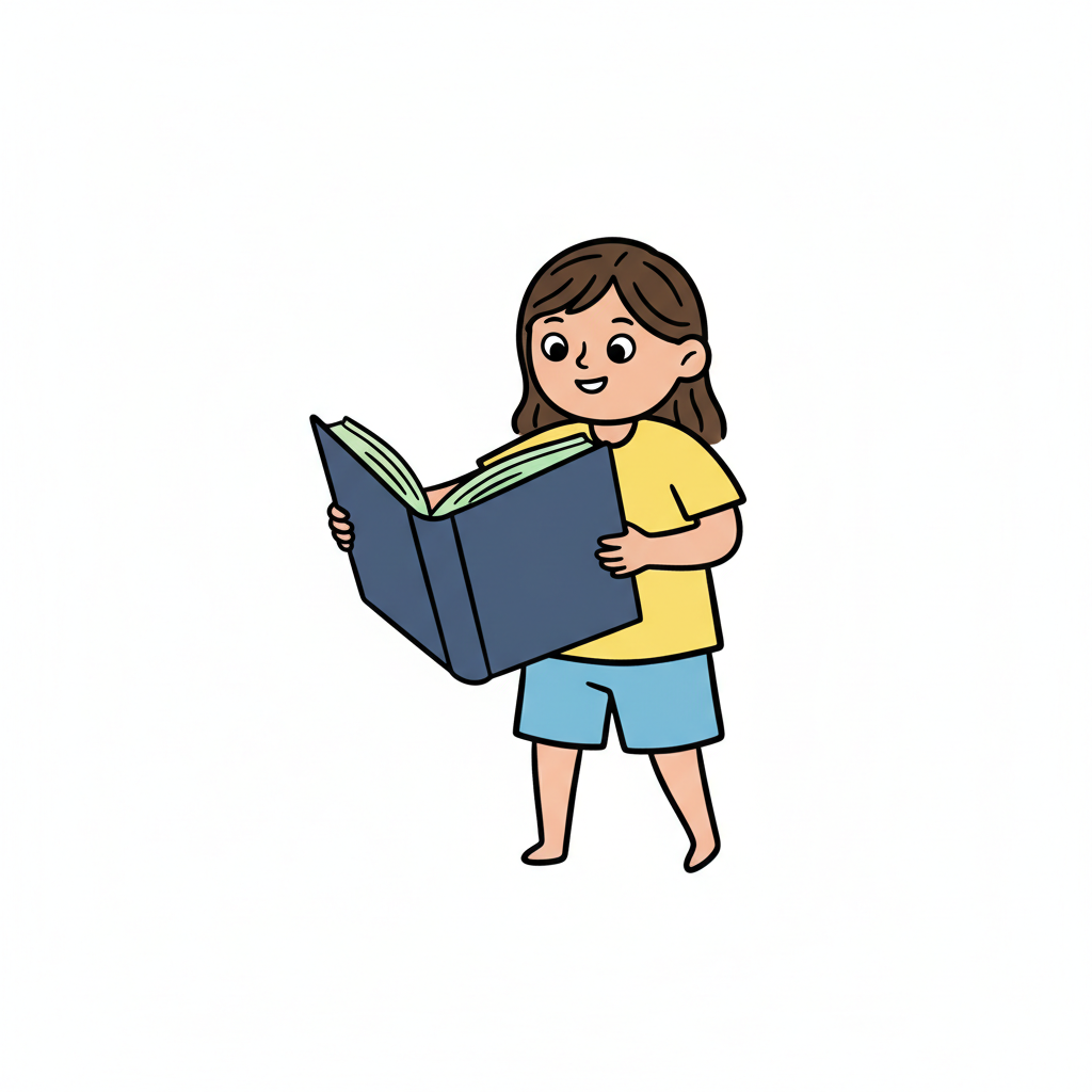 Ein lächelndes Cartoon-Mädchen mit braunen Haaren liest ein blaues Buch.