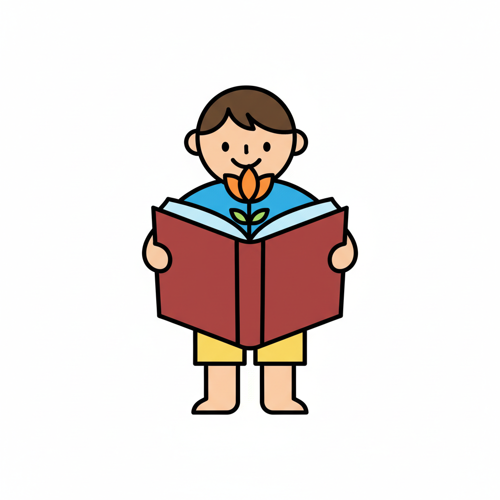 Ein lächelnder Cartoon-Junge liest ein Buch, aus dem eine Blume sprießt.