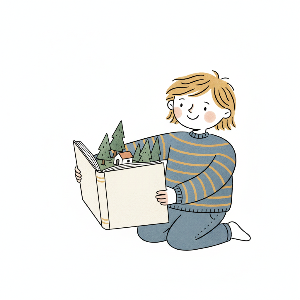 Ein lächelndes Kind liest ein Buch, aus dem eine kleine Landschaft mit Haus und Bäumen wächst.