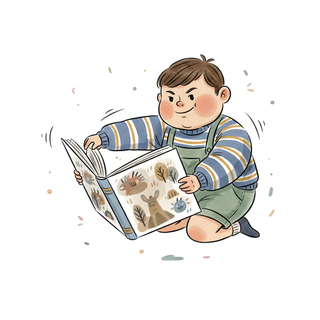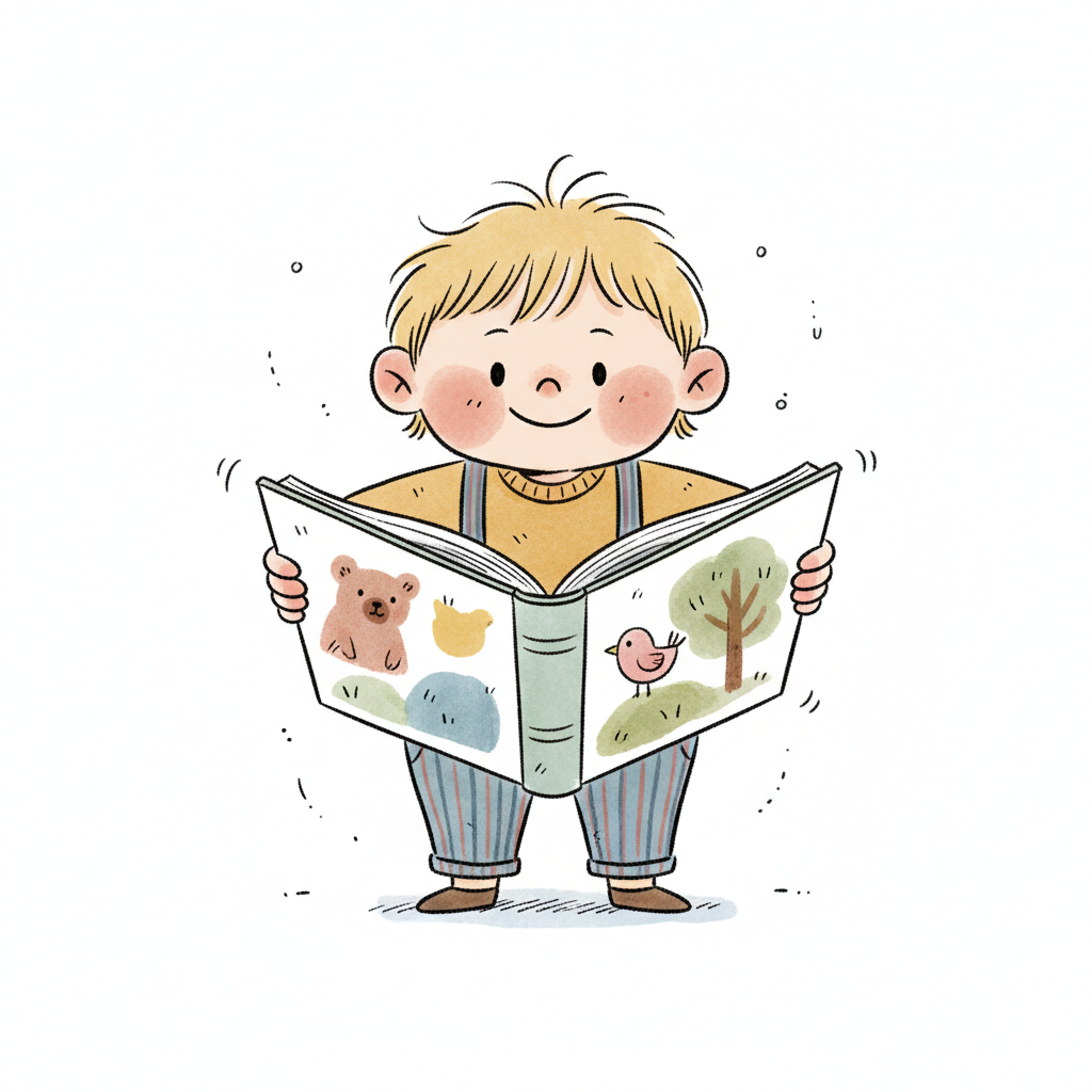 Kleines, lächelndes Kind liest ein offenes Bilderbuch mit Tier- und Naturillustrationen.