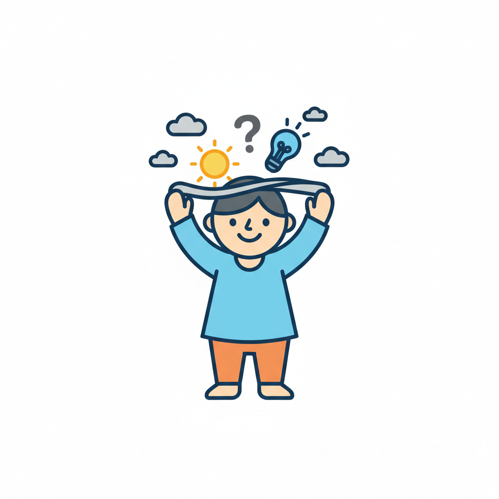 Lachende Person mit Ideen und Fragen über dem Kopf, symbolisiert Kreativität und Denken.
