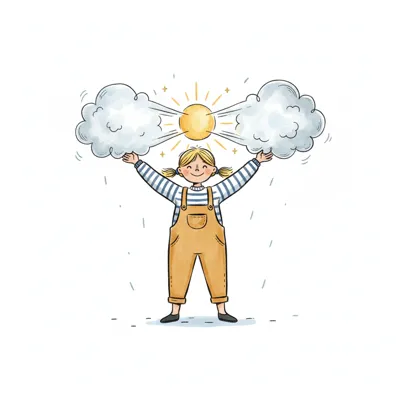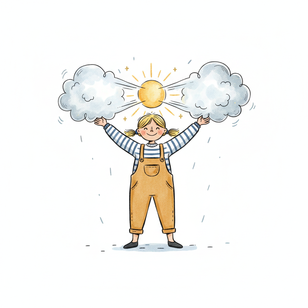 Fröhliches Mädchen hält Wolken auseinander, um die Sonne scheinen zu lassen.