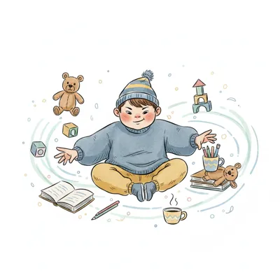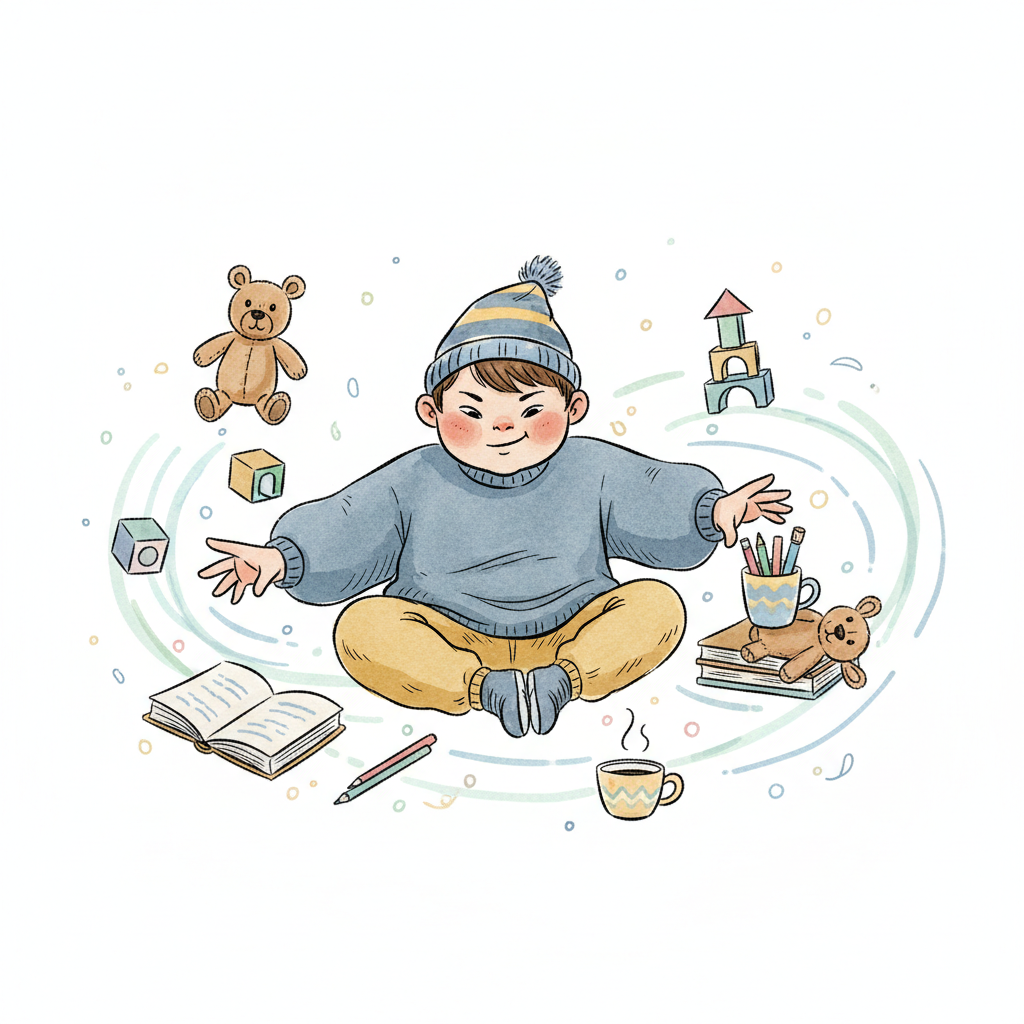 Ein lächelndes Kind sitzt mit Spielzeug, Büchern und Kaffee, umgeben von Fantasie.